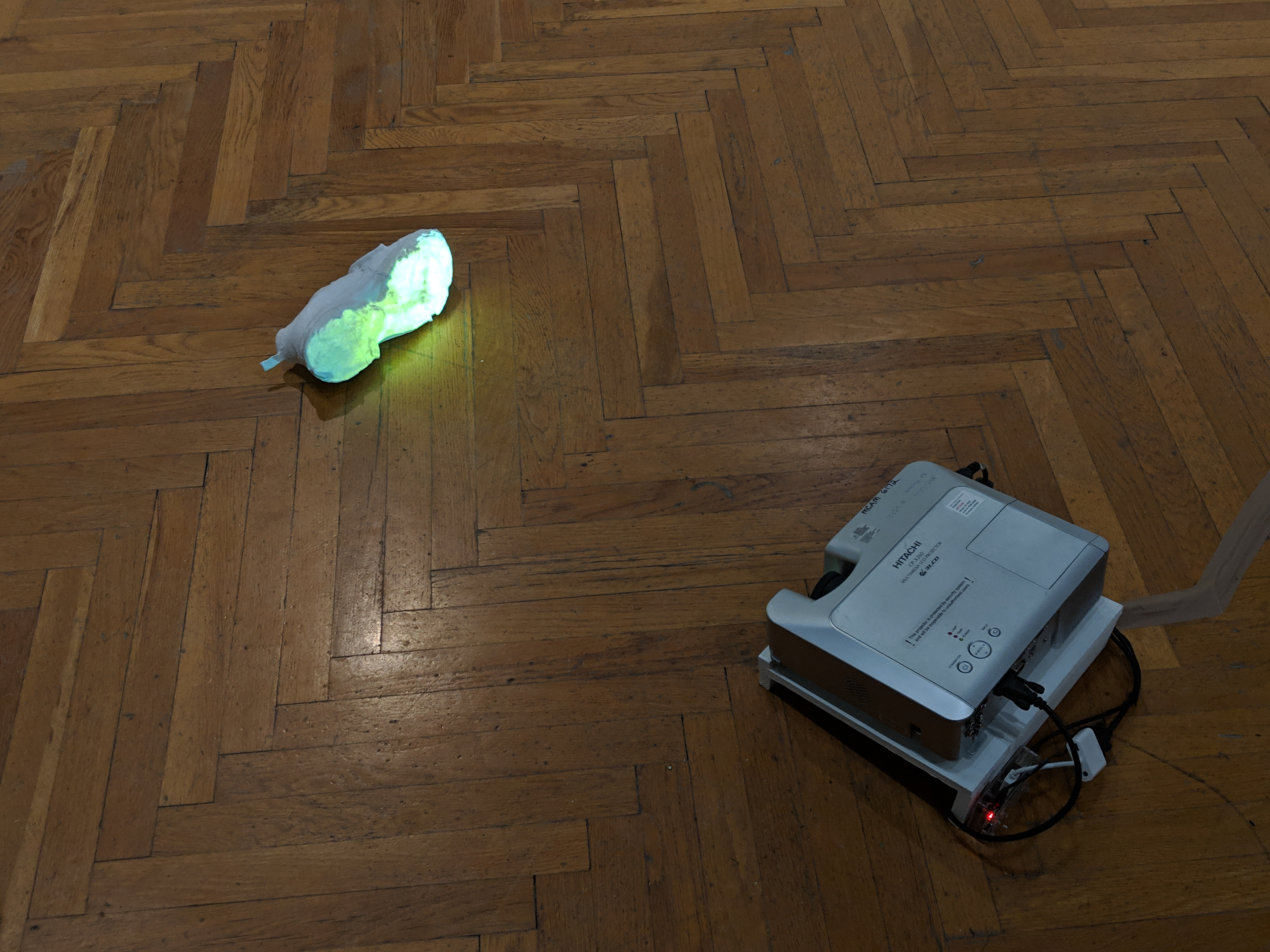 A shoe 3D printed from a 3D scan. A hidden camera projects the image of viewers onto the bottom of the shoe.